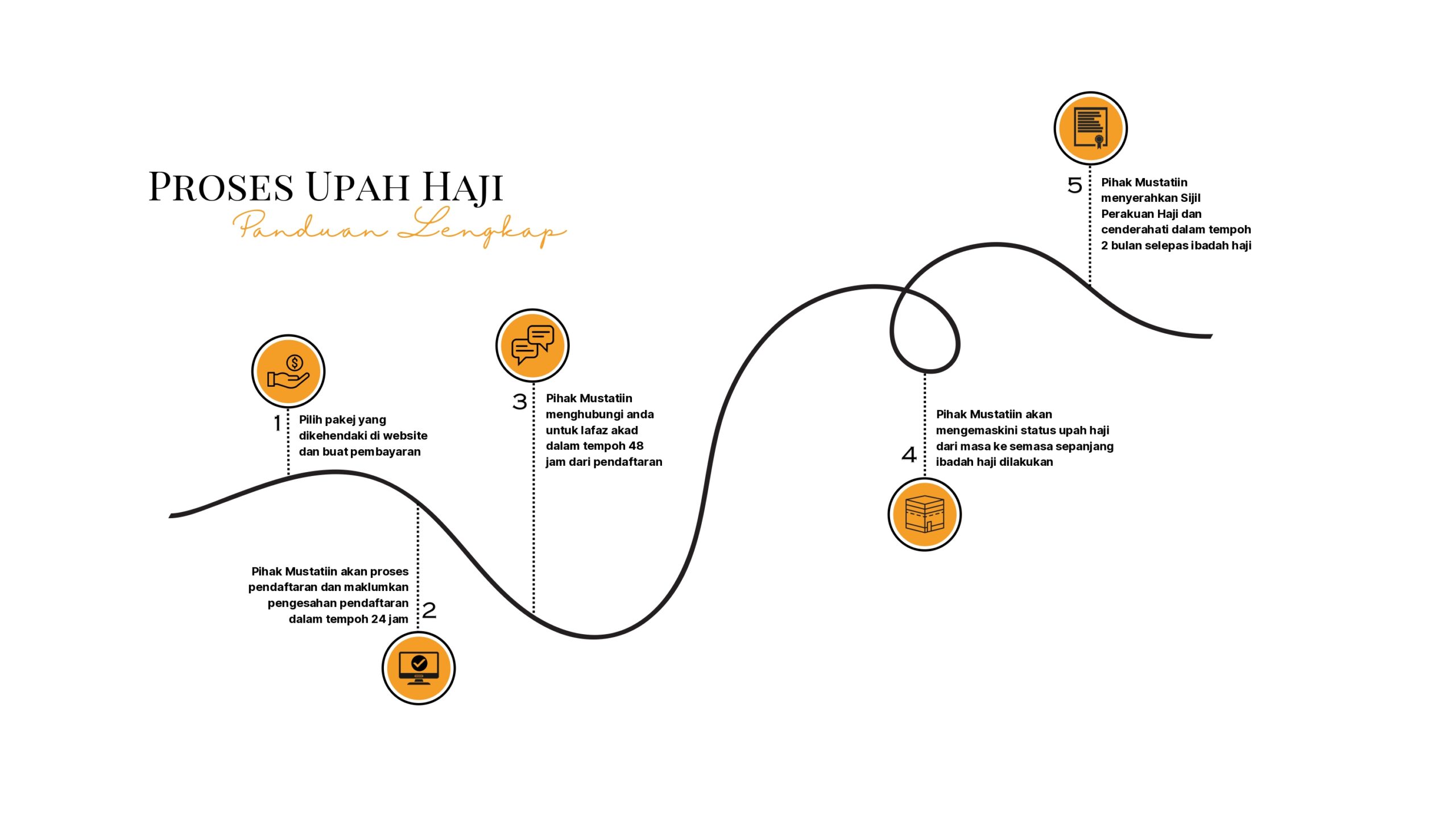 Proses pendaftaran boleh dilakukan dengan memilih pakej yang anda kehendaki di website kami. Setelah itu, kami akan memproses dan memaklumkan kepada anda pengesahan pendaftaran dalam tempoh 24 jam. Seterusnya, kami akan menghubungi anda untuk lafaz akad upah haji dalam tempoh 48 jam dari tarikh pendaftaran. Kami akan menyempurnakan upah haji anda pada bulan haji dan seterusnya menyerahkan Sijil Perakuan Upah Haji dan cenderahati.